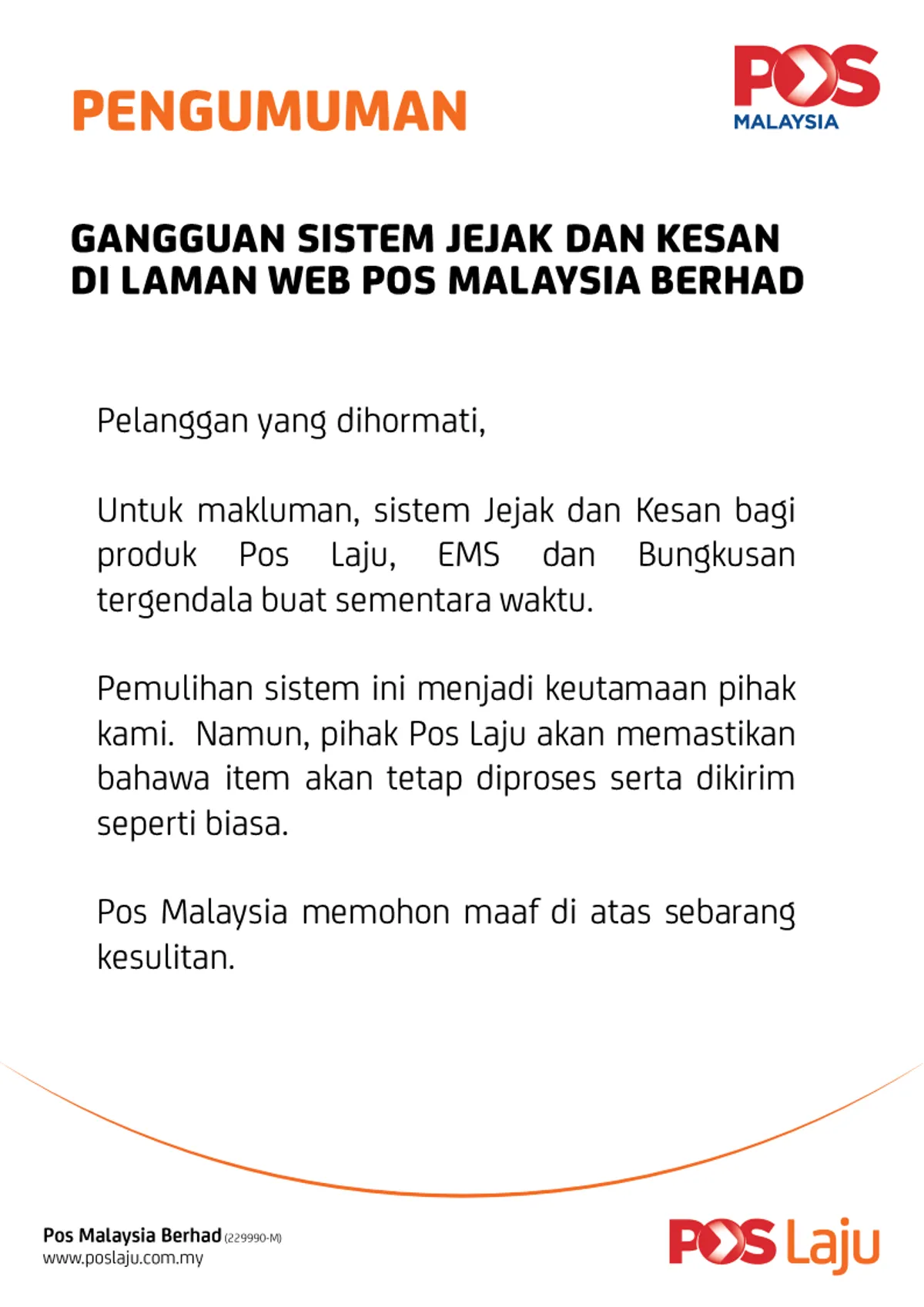 Pos Malaysia Berhad Important Notice Track Trace System Disruption On Pos Malaysia Berhad And Pos Laju Websites Facebook from lookaside.fbsbx.com Pos malaysia tracking tracking service online.enter document number to get status.pos laju tracking delivery information. Pos laju is the leading courier company in malaysia, connecting over 80% of populated areas across the country with its next day delivery and other services. Track pos laju packages using free online tracker, verify tracking number format, get package location and status. It contains most of the global couriers as well as local shipping providers and post/ems companies. Notify receiver via email on tracking statuses. Provide poslaju parcel tracking api and contact. Enter tracking number to track your poslaju packages and get delivery status online. It supports both domestic and international cek pos laju.