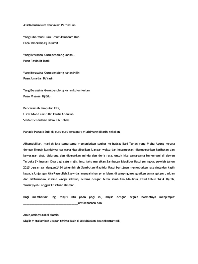 Teks Pengacara Majlis Sambutan Maulidur Rasul Peringkat Sekolah Bechah Durian from reader015.staticloud.net Teks pengacara majlis maulidur rasul 1. Teks pengacara majlis program sambutan maulidur rasul pada 10. Teks pengacara majlis sambutan maulidur rasul. 0% 0% found this document not useful, mark this document as not useful. Teks pengacara majlis maulidur rasul. Syukur ke hadrat ilahi dengan izinnya kita berhimpun bagi tujuan sambutan maulidur rasul peringkat sk bangsar bagi tahun 2018. Teks pengacara majlis maulidur rasul peringkat sekolah. Teks pengacaraan sambutan maulidur rasul 1432 h surau almukmini jalan.